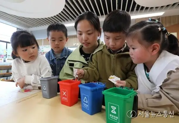 (사진=신화통신 제공) 【서울 = 신화/서울뉴스통신】 권나영 기자 = 22일 장쑤(江蘇)성 쑤저우(蘇州)시의 한 유치원에서 어린이들이 쓰레기 분리수거 체험을 하고 있다. 이날...