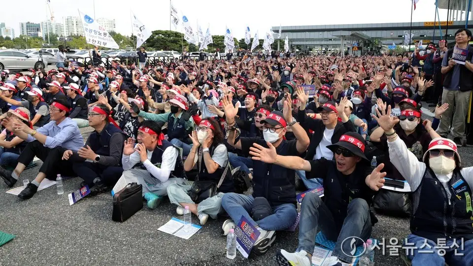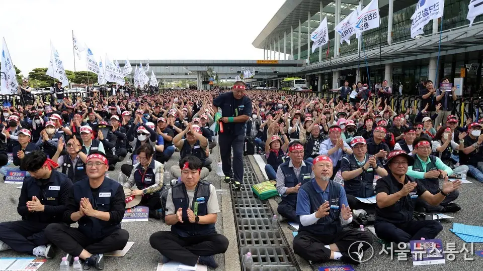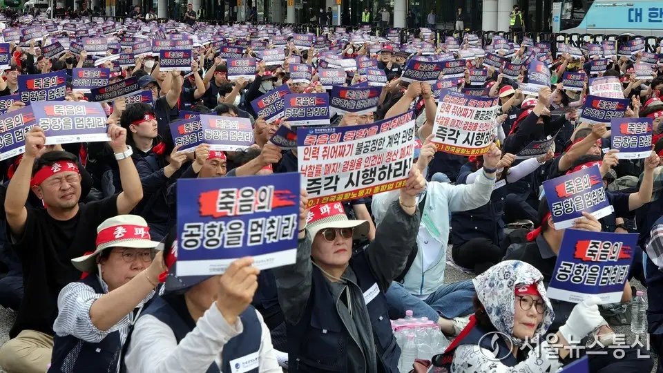 【서울 = 서울뉴스통신】 송경신 기자 =전국공항노동자연대 관계자들이 1일 서울 김포공항 국내선 3번출구에서 열린 '10.1 전국공항노동자 총파업대회'에서 구호를 외치고 있다. 2025.10.01. / 서울뉴스통신...