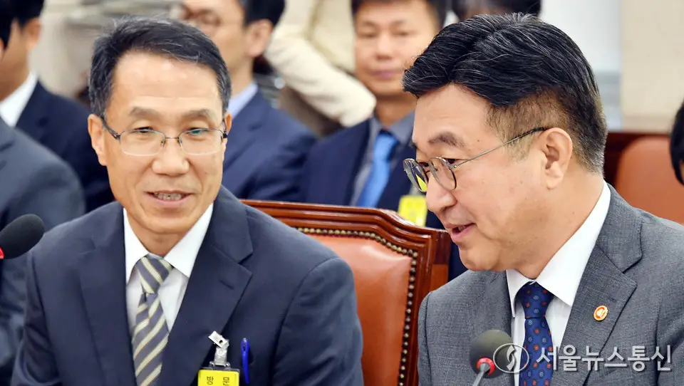 【서울 = 서울뉴스통신】 송경신 기자 = 윤호중 행정안전부 장관과 유재성 경찰청장 직무대행이 25일 서울 여의도 국회에서 열린 행정안전위원회 전체회의에서 대화하고...