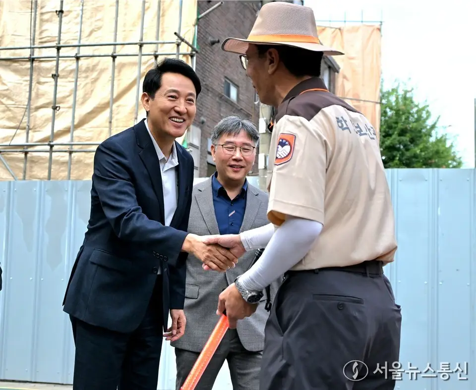초등학교 보안관과 인사 나누는 오세훈 시장