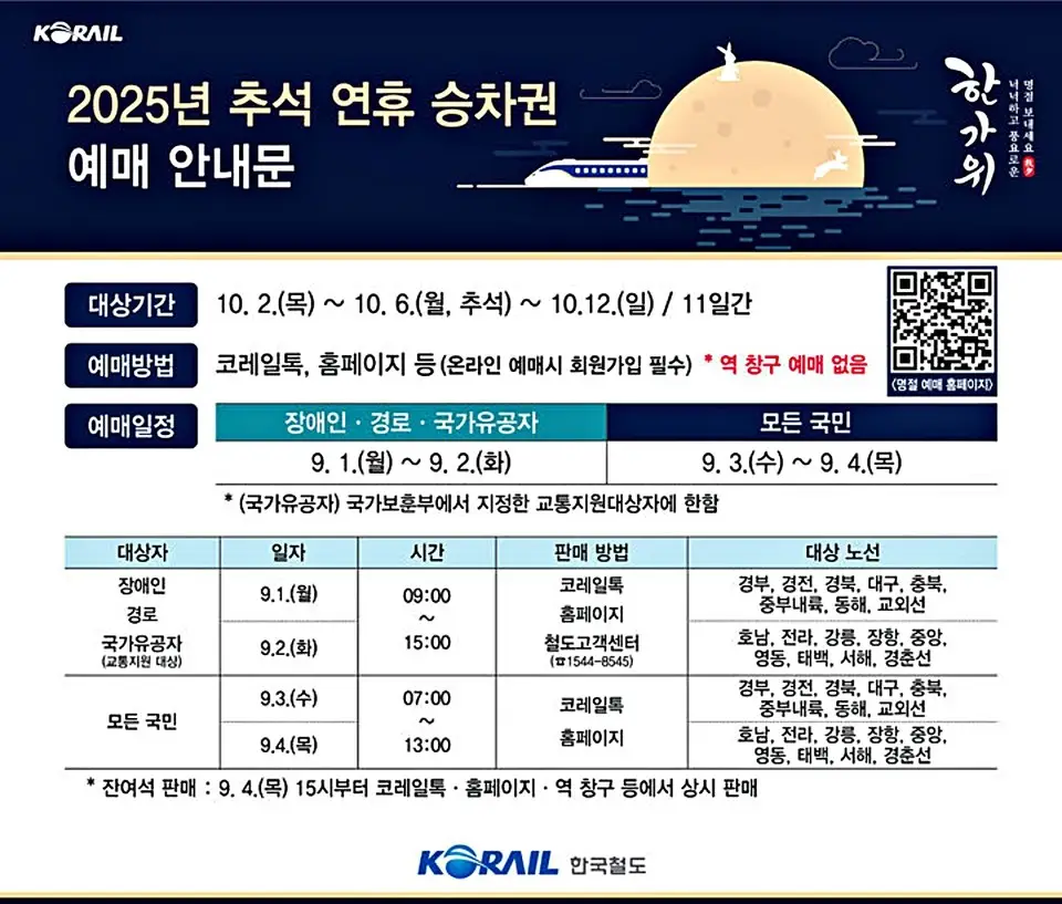 【서울 = 서울뉴스통신】 최정인 기자 = 한국철도공사(코레일)는 오는 10월 2일부터 12일까지 운행하는 추석 연휴 열차 승차권 예매를 9월 1일부터 4일까지 진행한다.이번...
