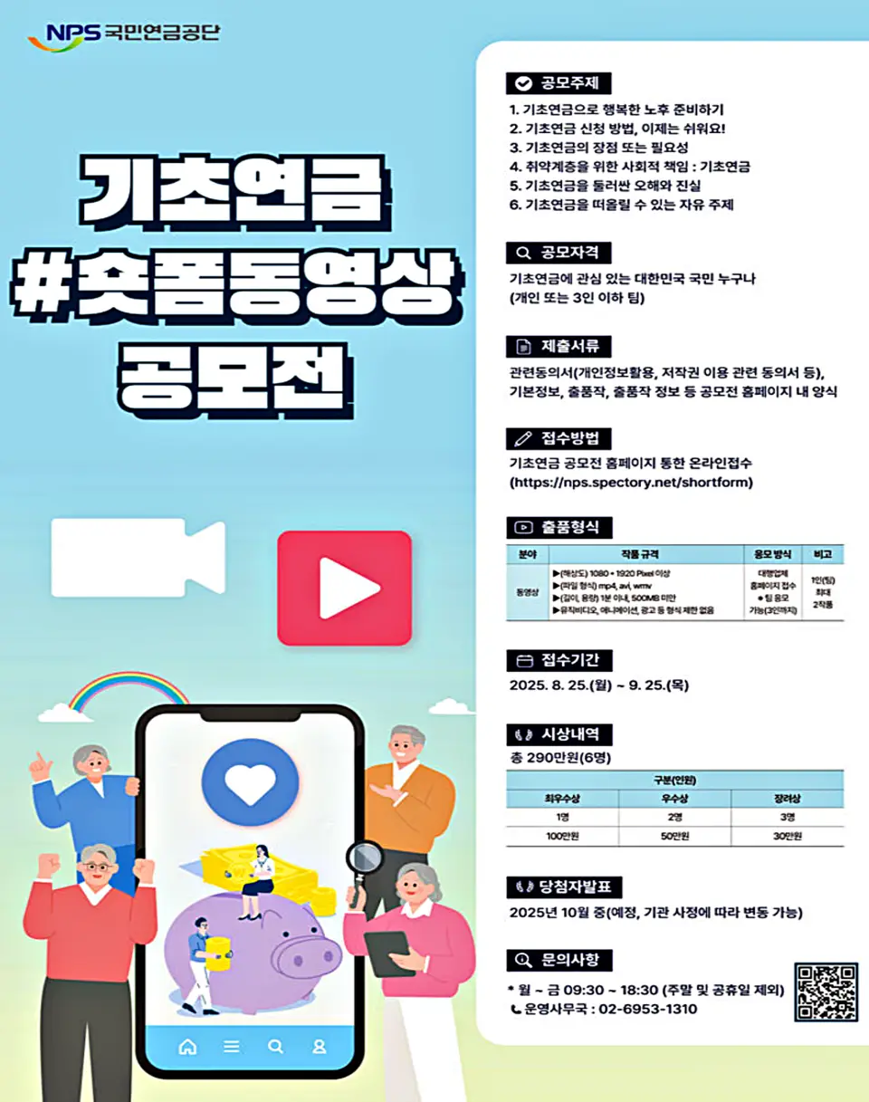 【서울 = 서울뉴스통신】 최정인 기자 = 국민연금공단은 기초연금 제도에 대한 올바른 이해와 긍정적 인식 확산을 위해 ‘기초연금 숏폼 동영상 공모전’을 연다.공모전은...