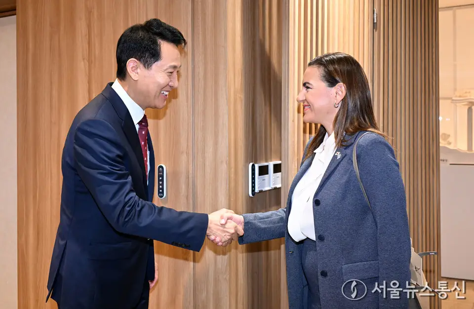 【서울 = 서울뉴스통신】 이민희 기자 = 오세훈 서울시장이 25일 서울 중구 서울시청에서 올가 케팔로야니 그리스 관광부 장관과 인사를 나누고 있다. (서울시 제공)...