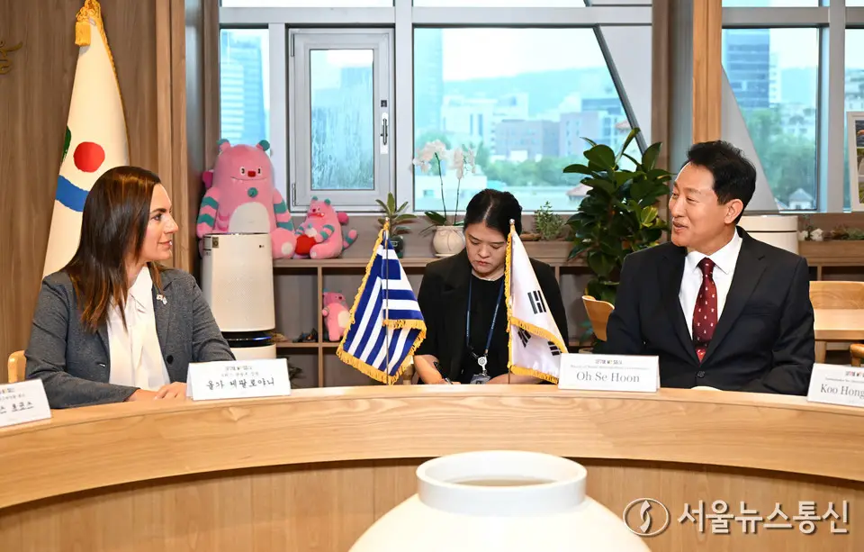 【서울 = 서울뉴스통신】 이민희 기자 = 오세훈 서울시장이 25일 서울 중구 서울시청에서 올가 케팔로야니 그리스 관광부 장관과 면담하고 있다. (서울시 제공) 2025.08.25....