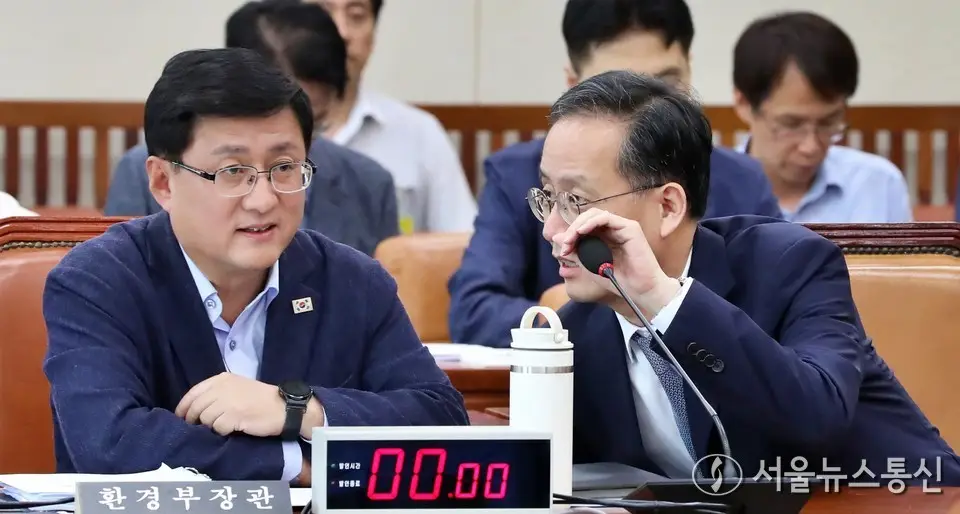 【서울 = 서울뉴스통신】 송경신 기자 = 김성환 환경부 장관(왼쪽)과 이형일 기획재정부 1차관이 18일 오후 서울 여의도 국회에서 열린 기후위기특위 전체회의에서...