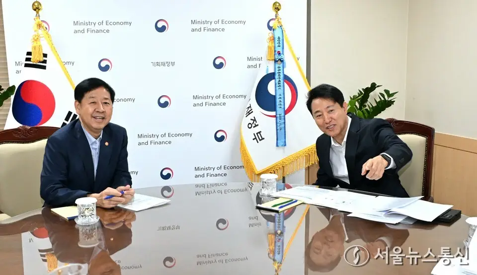 【서울 = 서울뉴스통신】 이민희 기자 = 오세훈 서울시장이 14일 오전 정부서울청사에서 구윤철 경제부총리 겸 기획재정부 장관과 면담하고 있다. (서울시 제공) 2025.08.14. /...