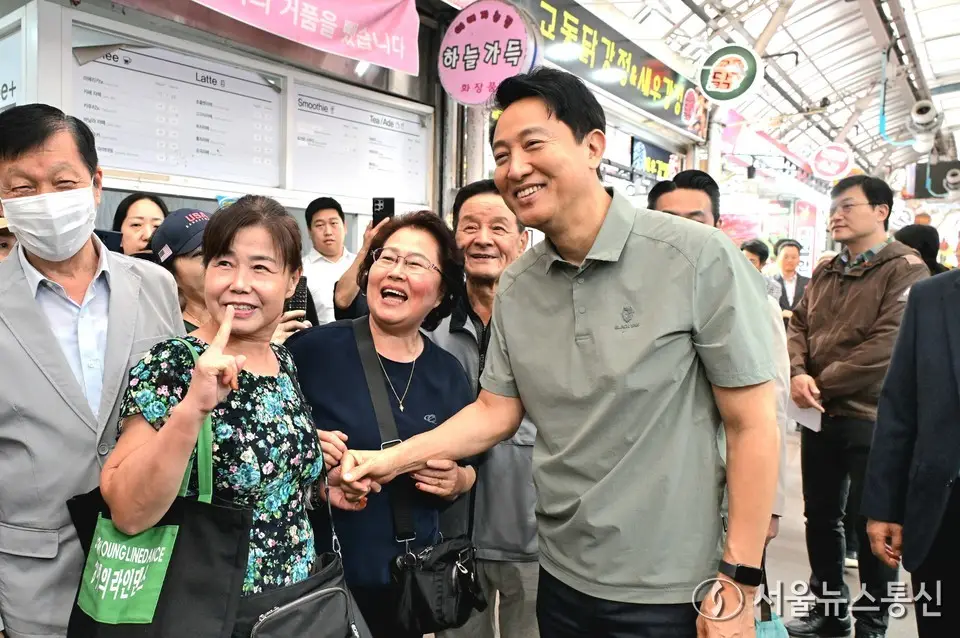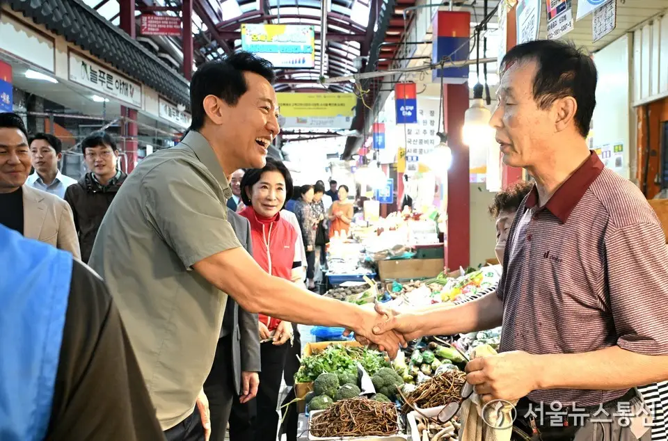 【서울 = 서울뉴스통신】 이민희 기자 = 오세훈 서울시장이 2일 추석 연휴를 앞두고 구로구 고척근린시장을 방문해 상인과 인사 나누고 있다. (서울시 제공) 2025.10.02. /...