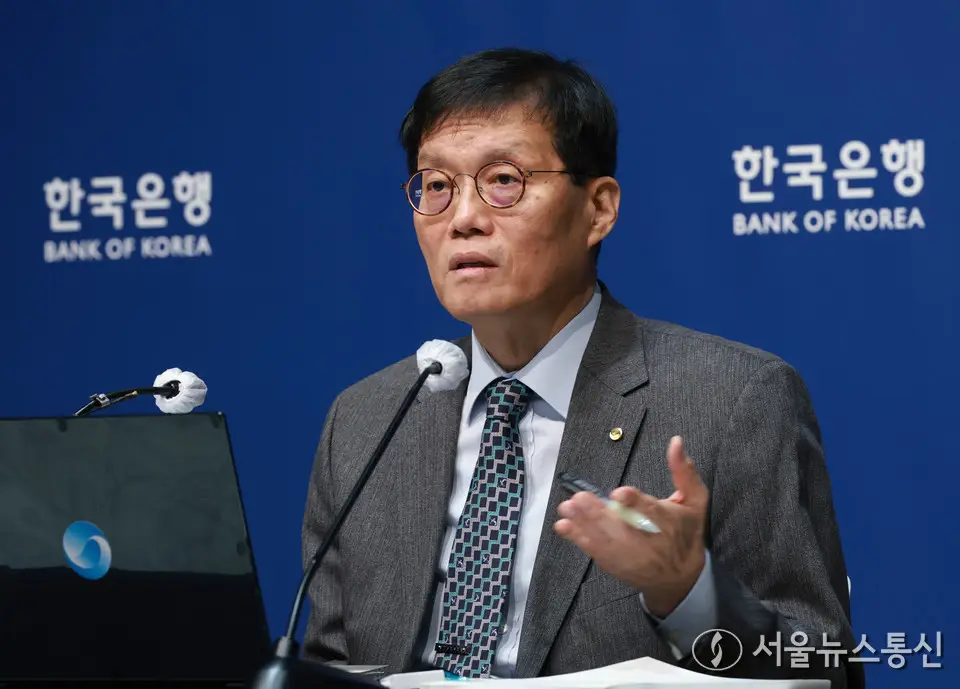 【서울 = 서울뉴스통신】 이민희 기자 = 이창용 한국은행 총재가 27일 서울 중구 한국은행에서 열린 통화정책방향 기자간담회에서 발언을 하고 있다. (한국은행 제공)...