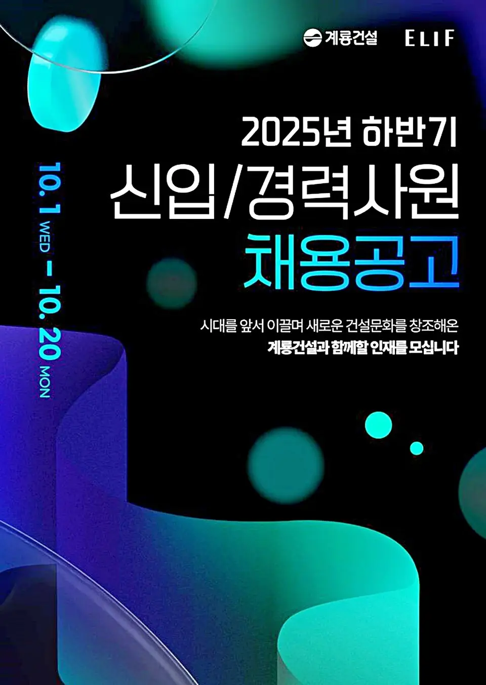 【서울 = 서울뉴스통신】 이성현 기자 = 계룡건설이 2025년도 하반기 신입 및 경력사원 공개채용을 진행한다고 15일 밝혔다. 이번 채용은 창립 55주년을 맞은...