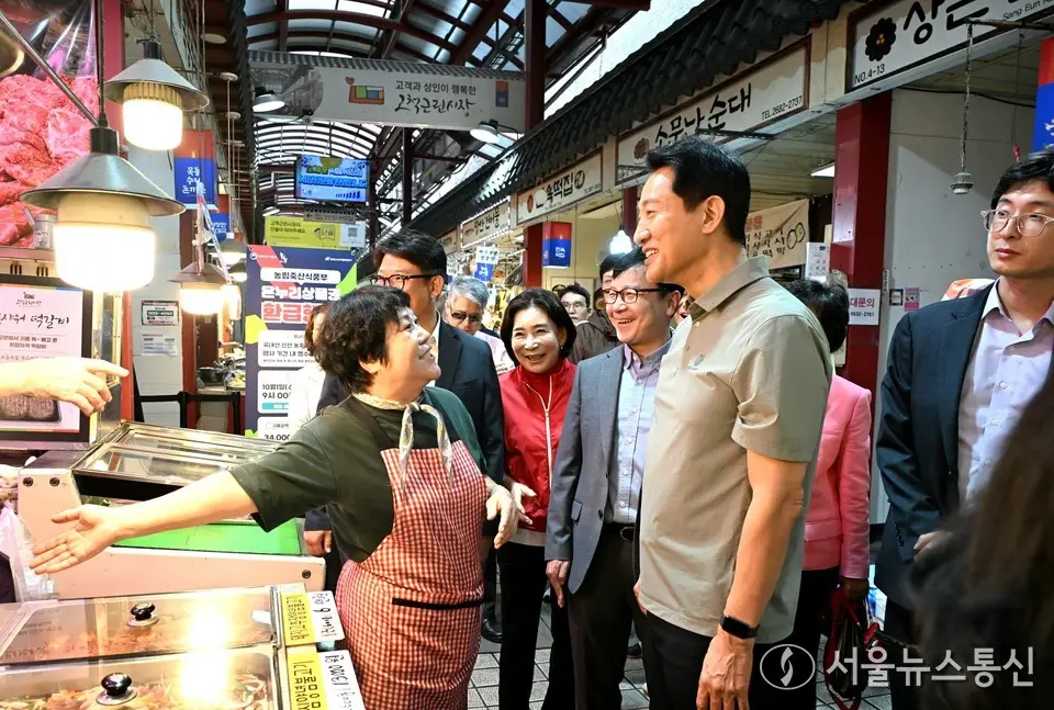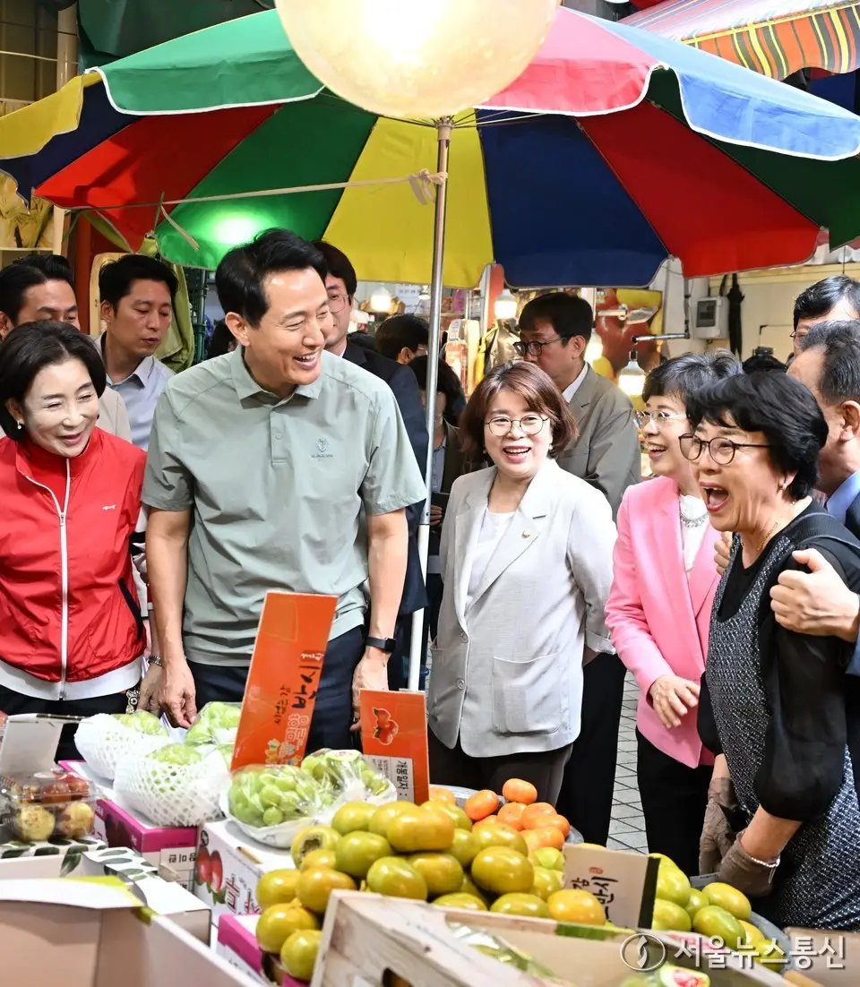 【서울 = 서울뉴스통신】 이민희 기자 = 오세훈 서울시장이 2일 추석 연휴를 앞두고 구로구 고척근린시장을 방문해 성수품 수급 상황을 점검하고 있다. (서울시 제공) 2025.10.02....