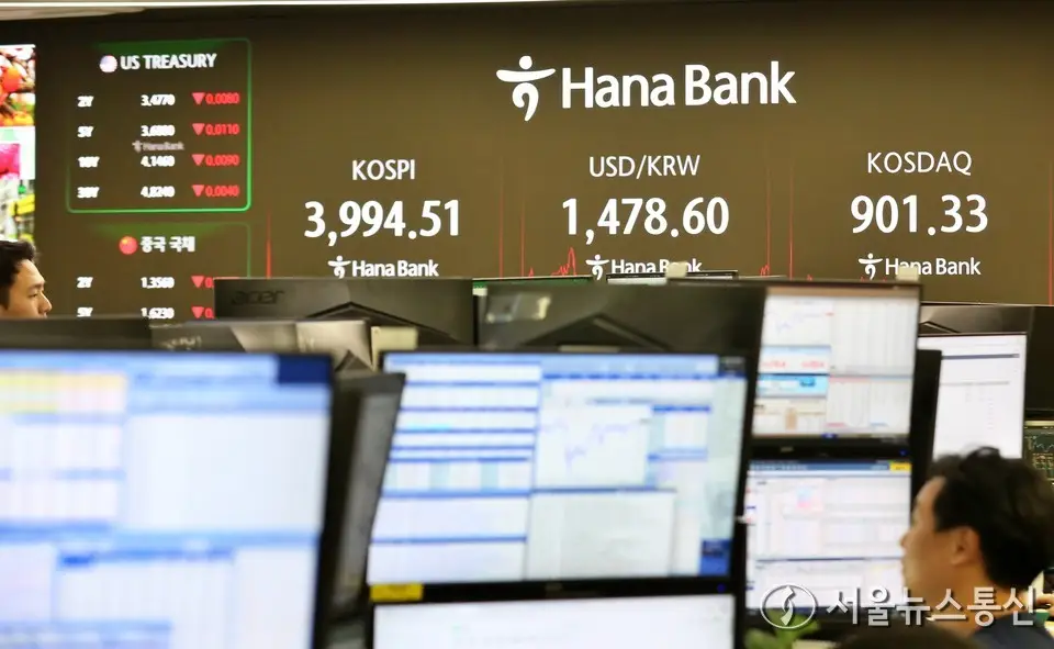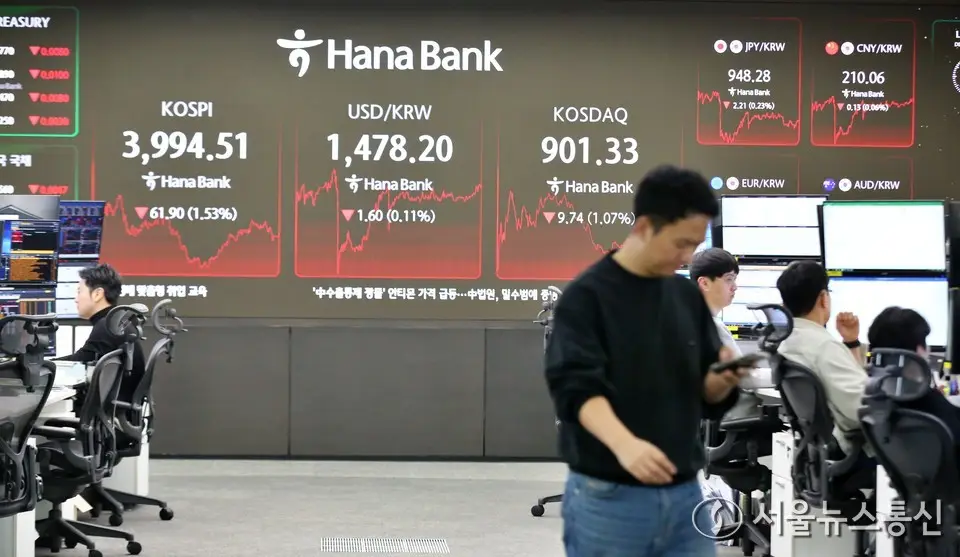 【서울 = 서울뉴스통신】 이민희 기자 = 코스피는 전 거래일보다 61.90포인트(1.53%) 내린 3994.51로 마감한 18일 서울 중구 하나은행 딜링룸 전광판에 지수가 나오고...