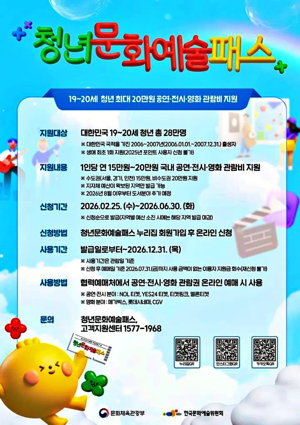 【서울 = 서울뉴스통신】 최정인 기자 = 한국문화예술위원회는 올해 19세와 20세가 되는 2006·2007년생을 대상으로 1인당 최대 20만원의 ‘청년 문화예술패스’를 발급한다고 9일 밝혔다. 청년...
