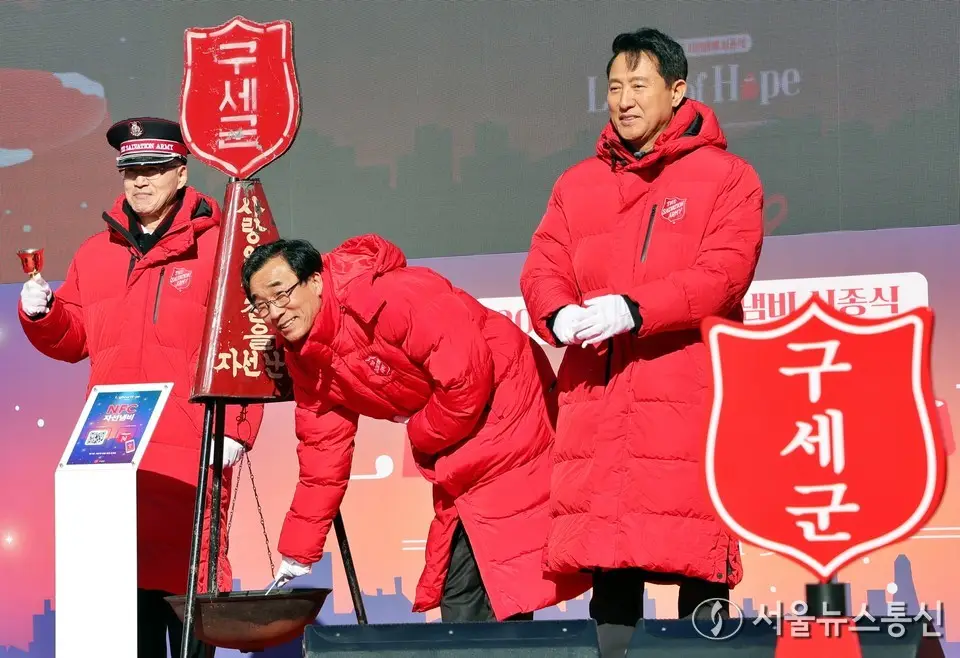 【서울 = 서울뉴스통신】 이민희 기자 = 전성환 대통령실 경청통합수석이 28일 서울 광화문광장에서 열린 '2025 구세군 자선냄비 시종식'에서 성금을 기탁하고 있다. 오른쪽은 오세훈 서울시장. 2025.11.28. snakorea.rc@gmail.com