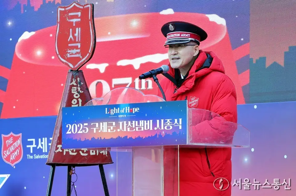 【서울 = 서울뉴스통신】 이민희 기자 = 김병윤 구세군 사령관이 28일 서울 광화문광장에서 열린 '2025 구세군 자선냄비 시종식'에서 인사말을 하고 있다. 2025.11.28. snakorea.rc@gmail.com