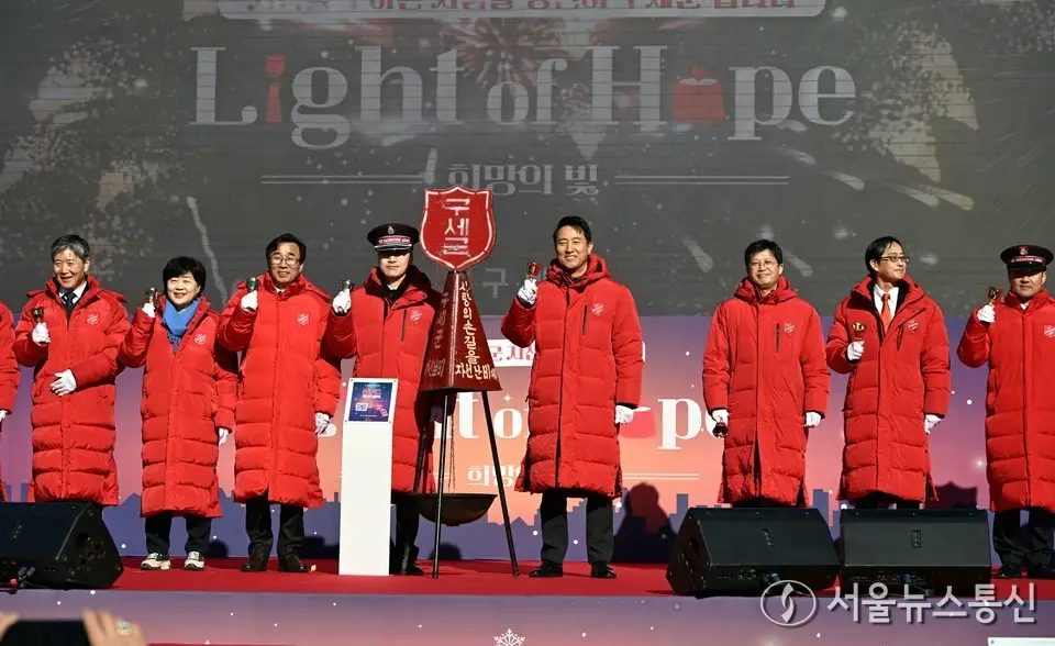 【서울 = 서울뉴스통신】 이민희 기자 = 오세훈 서울시장이 28일 오전 서울 종로구 광화문광장에서 열린 '2025 구세군 자선냄비 시종식'에서 참석자들과 타종 세리머니를 하고 있다. (서울시 제공) 2025.11.28. / snakorea.rc@gmail.com