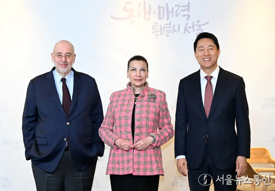 【서울 = 서울뉴스통신】 이민희 기자 = 오세훈 서울시장이 16일 서울 중구 서울시청에서 아부다비 음악예술재단 후다 알카미스 카누 이사장(가운데), 카누그룹 모하메드 압둘 라티프 카누 부회장(왼쪽)과 기념촬영하고 있다. (서울시 제공) 2025.12.16. / snakorea.rc@gmail.com