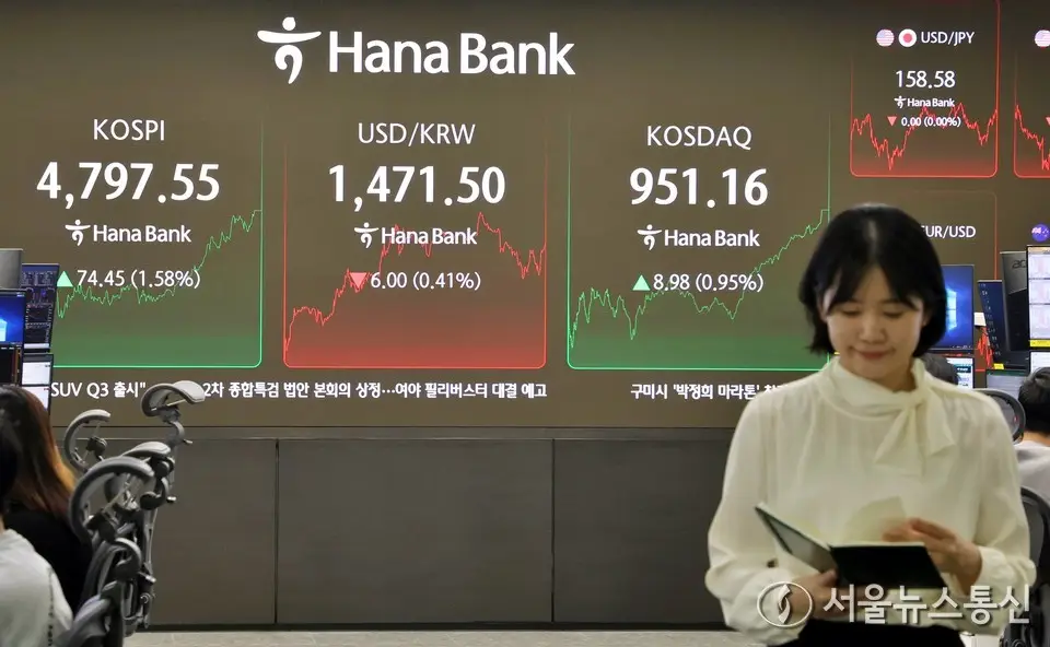 【서울 = 서울뉴스통신】 이민희 기자 = 15일 코스피가 전 거래일(4723.10)보다 74.45포인트(1.58%) 상승한 4797.55에 마감한 15일 오후 서울 중구 하나은행 딜링룸 전광판에 지수가 표시되어 있다. 코스닥 지수는 전 거래일(942.18)보다 8.98포인트(0.95%) 오른 951.16, 서울 외환시장에서 원·달러 환율은 전 거래일(1477.5원)보다 7.8원 내린 1469.7원에 주간 거래를 마감했다. 2026.01.15. nimini73@daum.net