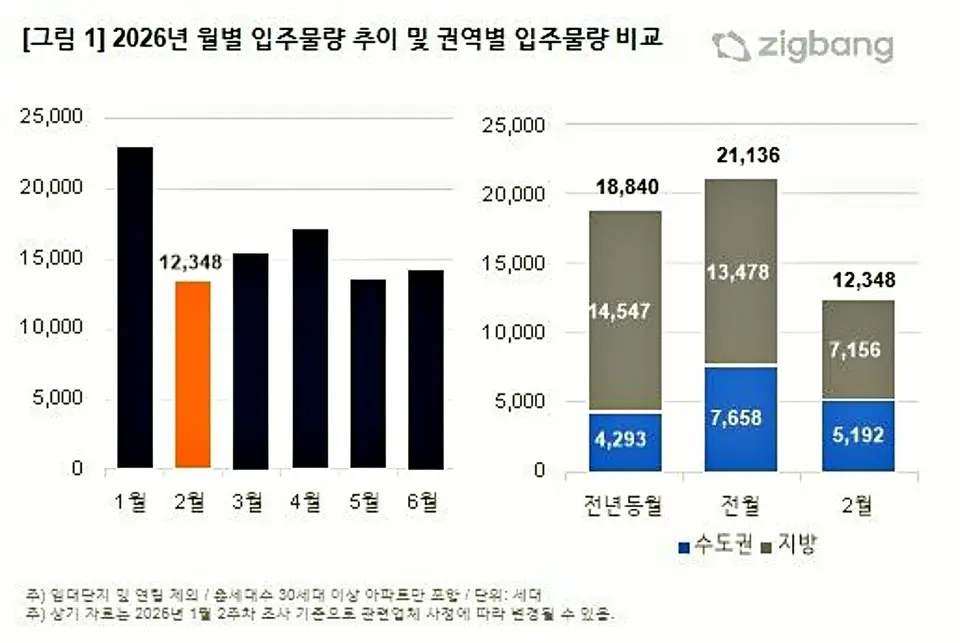 26일 직방 조사에 따르면 2월 전국 아파트 입주 물량은 1만2348가구로 집계됐다. 이는 1월(2만1136가구) 대비 42%(8788가구) 감소한 수치이며, 전년 동월(1만8840가구)과 비교해도 6492가구 줄었다. 올해 상반기 기준으로 가장 적은 물량이다.