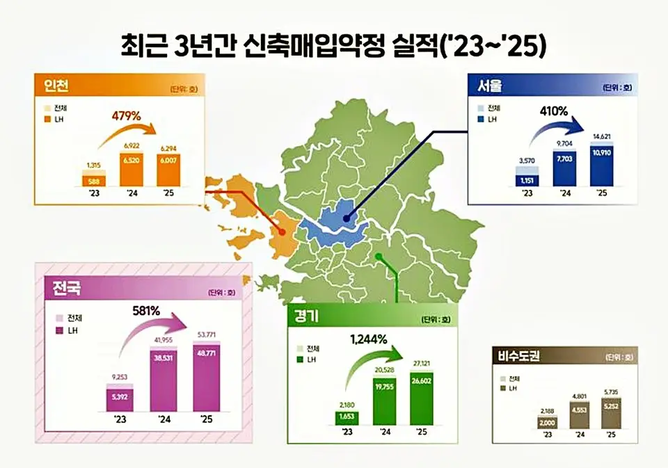 28일 국토교통부와 한국토지주택공사에 따르면 2025년 신축매입약정 체결 실적은 5만3771호로 집계됐다. 이는 2023년(9253호) 대비 약 6배 증가한 역대 최대 규모다. 이 가운데 89.3%인 4만8036호가 수도권에 위치했다. 공급 주체별로는 LH가 4만3519호, 지방공사가 4517호를 차지했으며, 서울 물량만 1만4621호에 달했다.