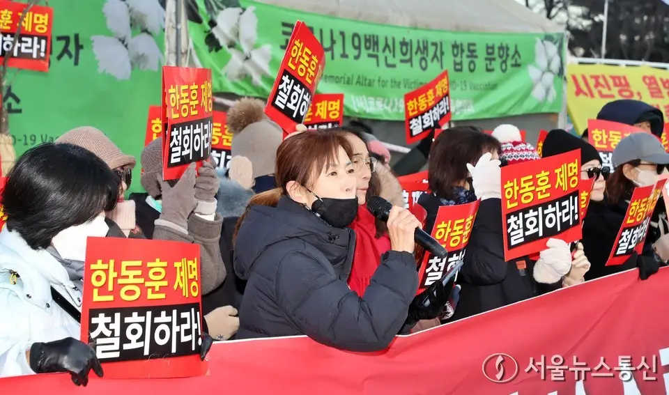【서울 = 서울뉴스통신】 이성현 기자 = 한동훈 전 국민의힘 대표 지지자들이 29일 오전 서울 여의도 국회 앞에서 기자회견을 열고 한 전 대표 제명 철회를 촉구하고 있다. 2026.01.29. snakorea.rc@gmail.com