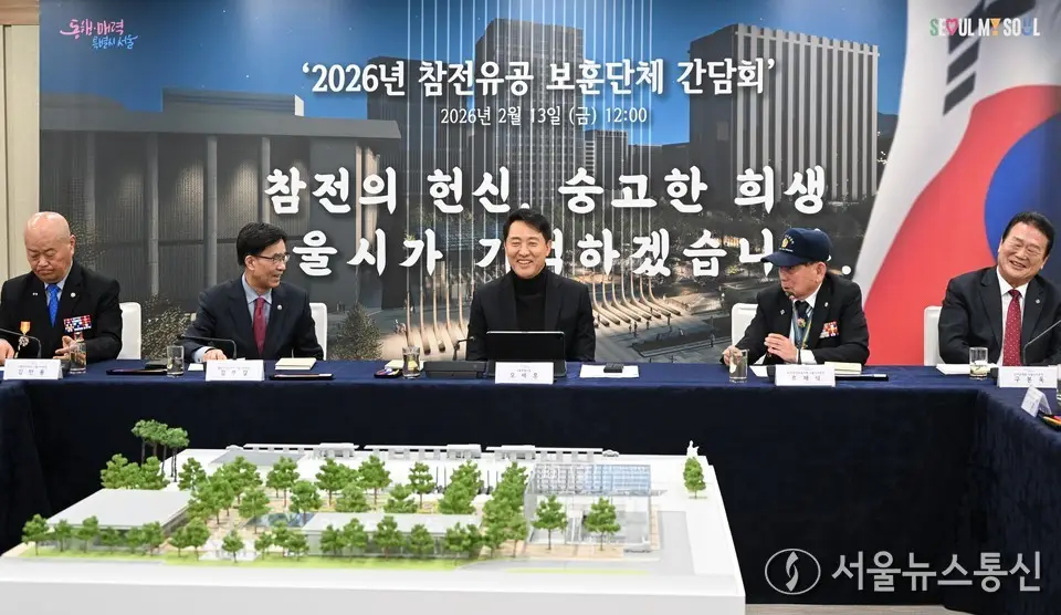 【서울 = 서울뉴스통신】 이민희 기자 = 오세훈 서울시장이 13일 서울 중구 서울시청 에서 열린 ‘참전유공 보훈단체 간담회’에서 참석자들과 대화 하고 있다. (서울시 제공) 2026.02.13. nimini73@daum.net