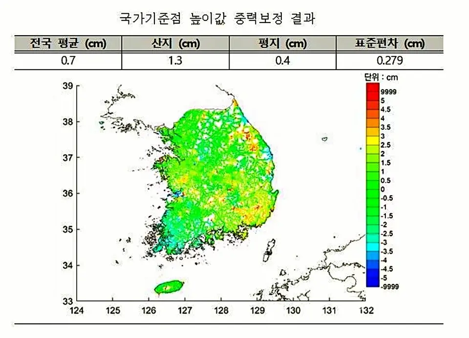이번 실측 중력값 반영으로 국가기준점은 약 2㎞ 간격으로 전국에 설치된 기준점 높이값이 전국 평균 0.7㎝ 개선됐다. 구릉지는 0.8㎝, 산지는 1.3㎝, 평지는 0.4㎝ 각각 정확도가 높아졌다.