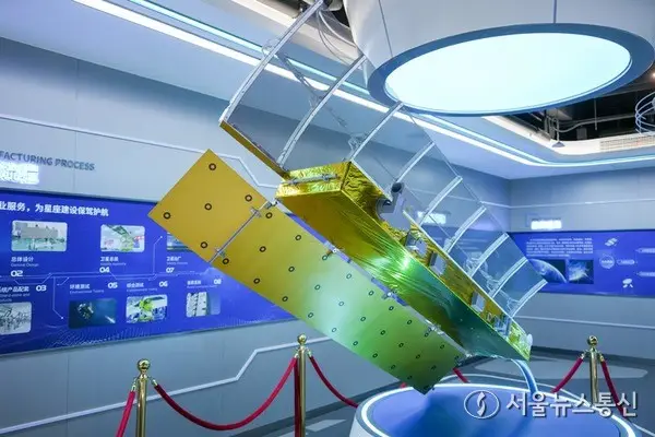 지난(濟南) 위성산업발전그룹회사의 최종조립기지에 전시된 위성 제품 모형. (사진=신화통신 제공)