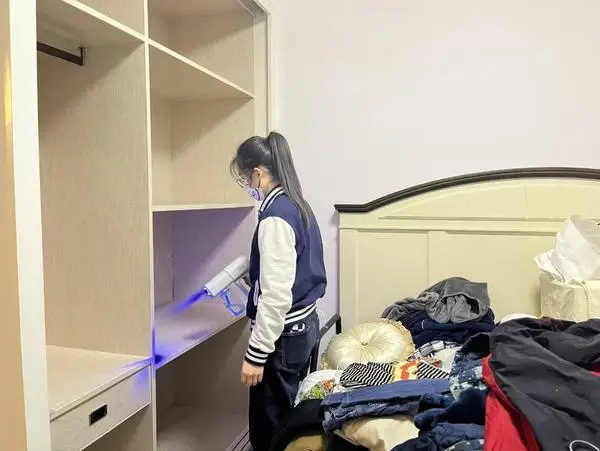 나이단(乃丹·31)이 지난해 4월 간쑤(甘肅)성 란저우(蘭州)시에 있는 고객의 집에서 옷장을 청소하고 있다. (사진=신화통신 제공)
