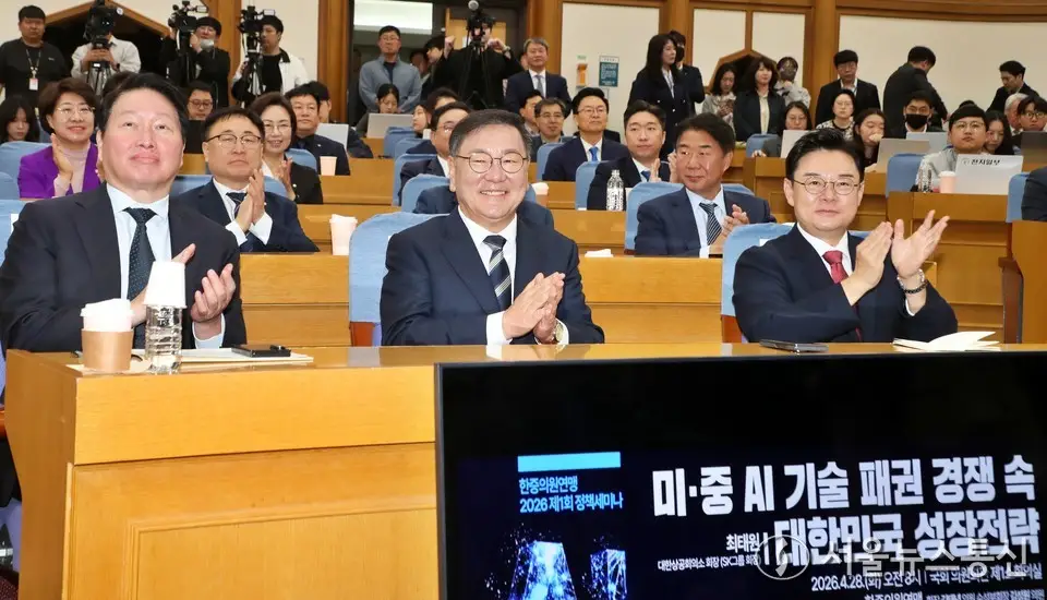 【서울 = 서울뉴스통신】 이민희 기자 = 최태원 대한상공회의소 회장이 28일 오전 서울 여의도 국회 의원회관에서 열린 한중의원연맹 제1회 정책세미나에서 참석자들과 기념촬영을 하고 있다. 2026.04.28. nimini73@daum.net