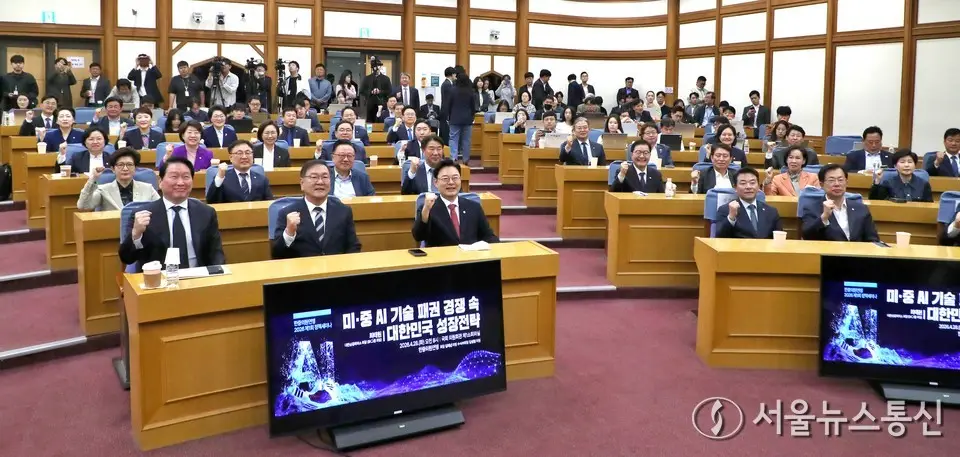 【서울 = 서울뉴스통신】 이민희 기자 = 최태원 대한상공회의소 회장이 28일 오전 서울 여의도 국회 의원회관에서 열린 한중의원연맹 제1회 정책세미나에서 참석자들과 기념촬영을 하고 있다. 2026.04.28. nimini73@daum.net