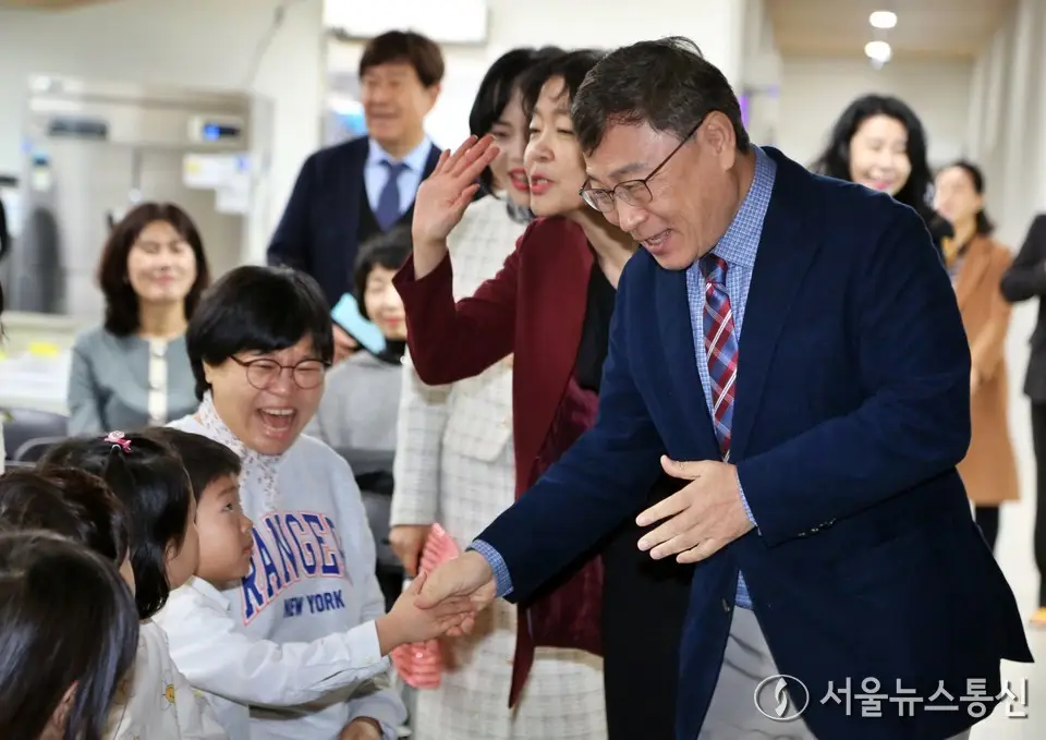 【서울 = 서울뉴스통신】 이민희 기자 = 정근식 서울시교육감이 27일 서울 동작구 공립단설 서울상도유치원에서 열린 이전식에서 원생들과 인사하고 있다. 2025.11.27. snakorea.rc@gmail.com
