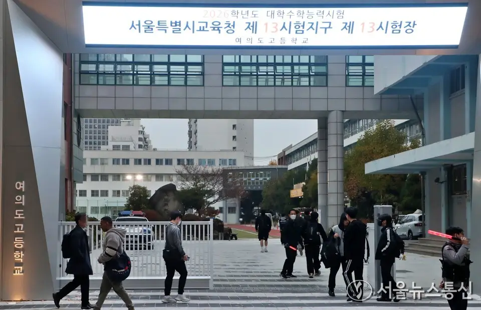 【서울 = 서울뉴스통신】 이성현 기자 = 2026학년도 대학수학능력시험일인 13일 오전 서울 영등포구 여의도 고등학교 앞에서 수험생들이 고사장으로 들어가고 있다. 2025.11.13....