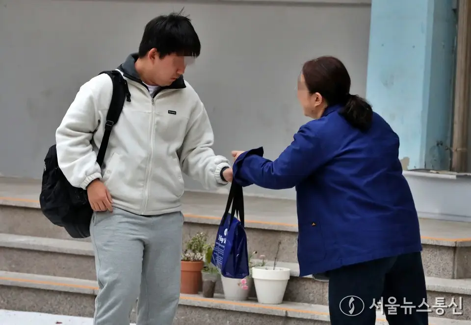 【서울 = 서울뉴스통신】 이성현 기자 = 2026학년도 대학수학능력시험일인 13일 오전 서울 영등포구 여의도 고등학교 앞에서 수험생 부모가 자녀에게 도시락을 건네주고 있다....
