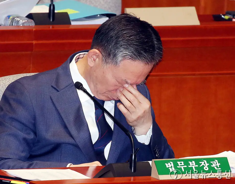 【서울 = 서울뉴스통신】 이민희 기자 = 정성호 법무부 장관이 12일 서울 여의도 국회에서 열린 예산결산특별위원회 전체회의에서 눈가를 만지고 있다. 2025.11.12. snakorea.rc@gmail.com