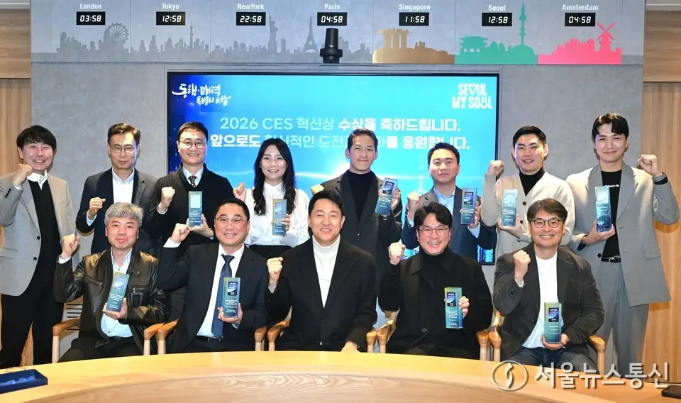 【서울 = 서울뉴스통신】 이민희 기자 = 오세훈 서울시장이 26일 서울시청에서 열린 ‘CES 2026 혁신상 수상 기업 간담회’에서 참석자들과 기념촬영하고 있다. (서울시 제공) 2026.01.26....