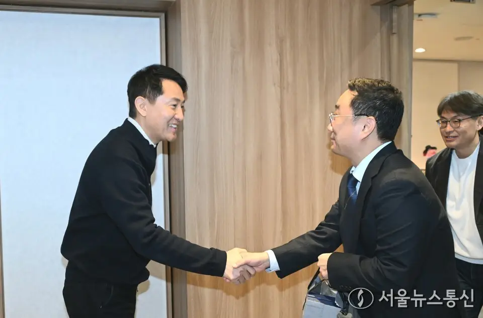 【서울 = 서울뉴스통신】 이민희 기자 = 오세훈 서울시장이 26일 서울시청에서 열린 ‘CES 2026 혁신상 수상 기업 간담회’에 앞서 참석자들과 인사를 나누고 있다. (서울시...