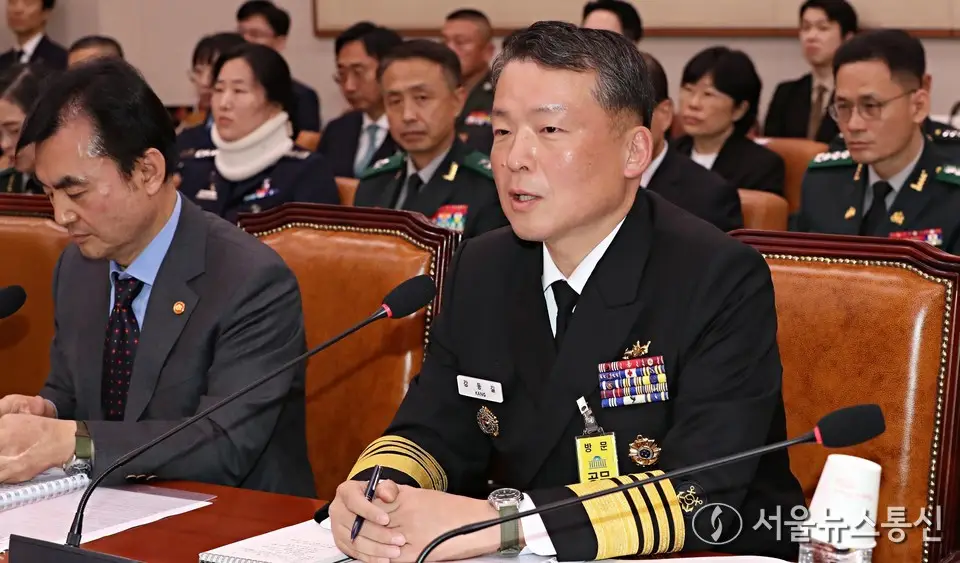 【서울 = 서울뉴스통신】 송경신 기자 = 강동길 해군참모총장이 17일 서울 여의도 국회에서 열린 법제사법위원회의 군사법원 국정감사에서 의원 질의에 답하고 있다. 2025.10.17. /...