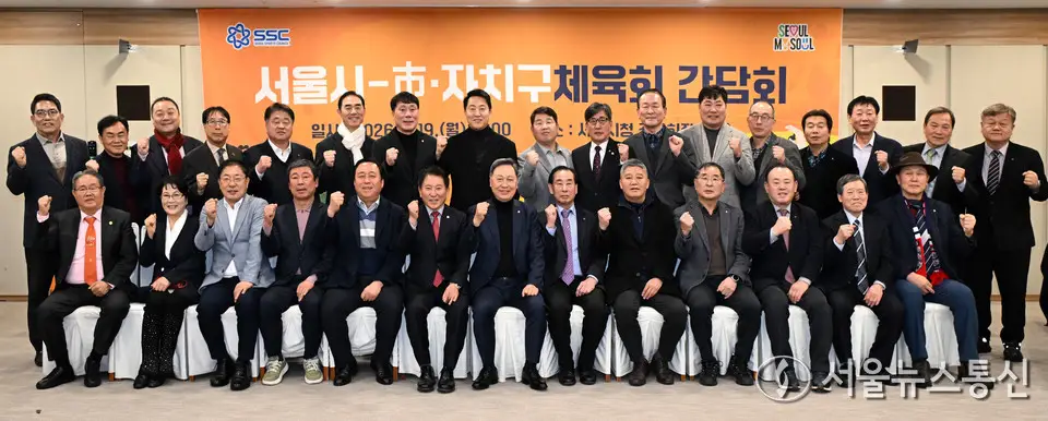 【서울 = 서울뉴스통신】 이민희 기자 = 오세훈 서울시장이 19일 서울시청에서 열린 서울시 및 자치구 체육회 간담회에서 참석자들과 기념촬영을 하고 있다. (서울시 제공)...