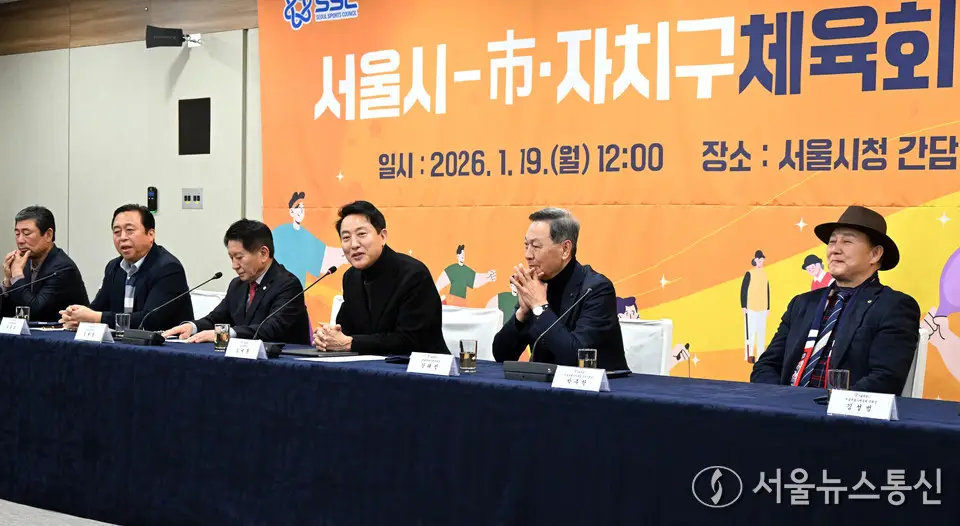 【서울 = 서울뉴스통신】 이민희 기자 = 오세훈 서울시장이 19일 서울시청에서 열린 서울시 및 자치구 체육회 간담회에서 인사말을 하고 있다. (서울시 제공)...